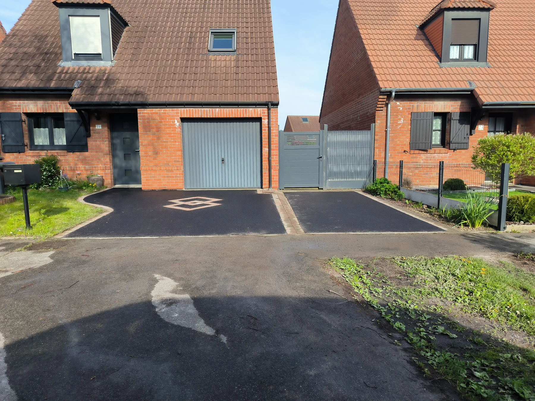 Décaissement de l'entrée ou se situé des pavés pour pouvoir y refaire des enrobés et également un motif voulu par le client tout en gardant une ligne pavé périphérique à la demande du client pour une intégration vis à vis de la façade